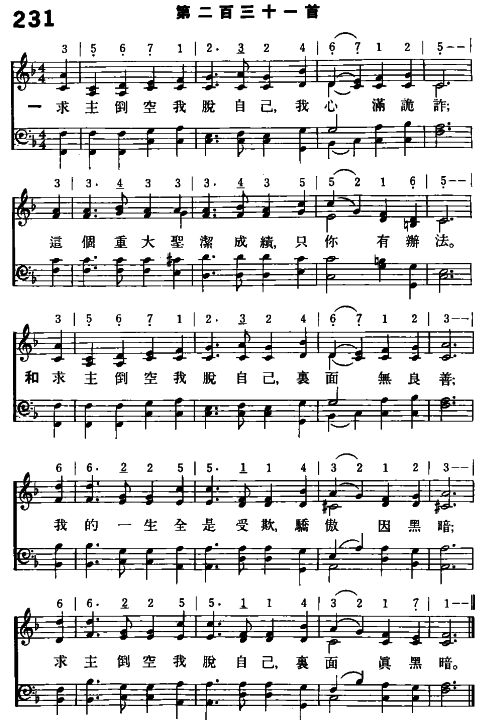 副歌 求主倒空我脫自己,裡面無良善; 我的一生全是受欺,驕傲因黑暗; 求主倒空我脫自己,裡面真黑暗。