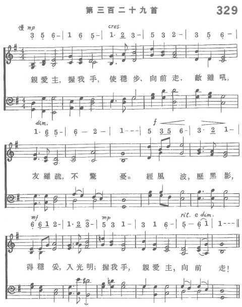 一 親愛主,握我手,使穩步,向前走, 敵雖吼,友雖疏,不驚憂。 經風波,歷黑影,得穩妥,入光明; 握我手,親愛主,向前走!