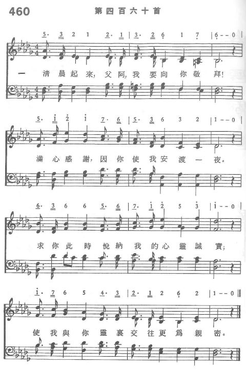 一 清晨起來,父阿,我要向你敬拜! 滿心感謝,因你使我安渡一夜。 求你此時悅納我的心靈誠實; 使我與你靈裡交往更為親密。