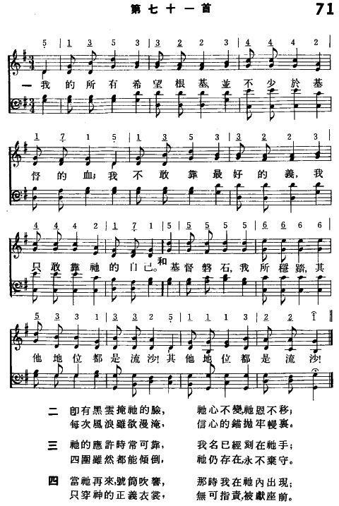 我的所有希望根基,並不少於基督的血; 我不敢靠最好的義,我只敢靠祂的自己。