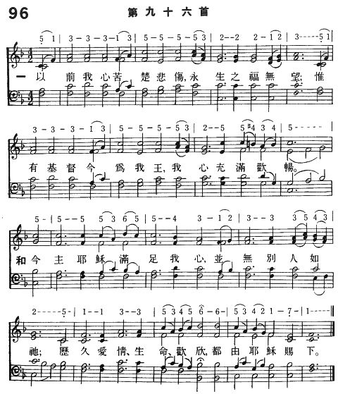 一 以前我心苦楚悲傷,永生之福無望; 惟有基督今為我王,我心充滿歡暢。