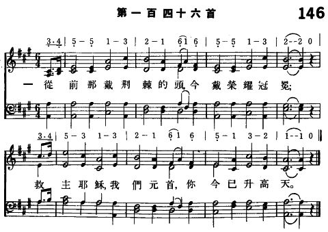 一 從前那戴荊棘的頭,今戴榮耀冠冕; 救主耶穌,我們元首,祢今已升高天。