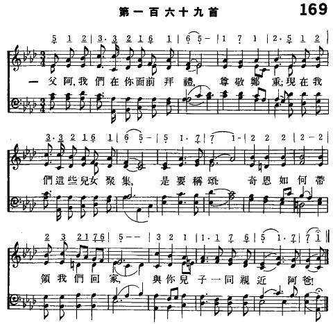 一 父阿,我們在祢面前拜禮,尊敬鄭重; 現在我們這些兒女聚集,是要稱頌; 奇恩如何帶領我們回家, 與祢兒子一同親近阿爸!