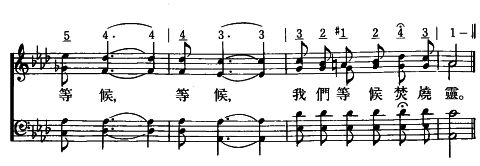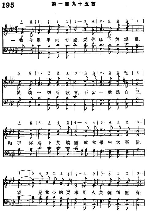 副歌 求祢賜下焚燒靈,成我畢生大事情; 滿足我心的要求,用火焚燒到無有; 等候,等候,我們等候焚燒靈。