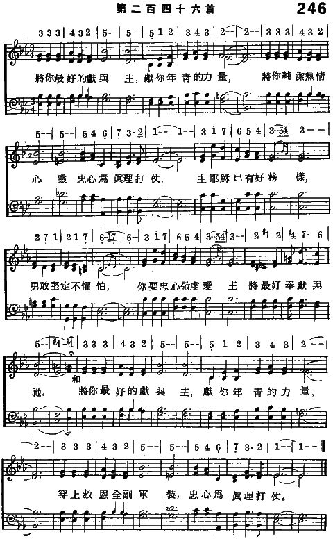 將你最好的獻與主,獻你年青的力量, 將你純潔熱情心靈 忠心為真理打仗; 主耶穌已有好榜樣,勇敢堅定不懼怕, 你要忠心敬虔愛主 將最好奉獻與祂。 將你最好的獻與主,獻你年青的力量, 穿上救恩全副軍裝,忠心為真理打仗。