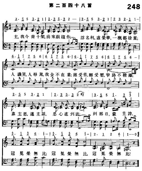 主, 我今背十架,前來跟隨你; 浮名利, 虛榮華,一概都捨棄; 人譏笑, 人辱罵,我全不在意; 雖受苦, 雖受壓,窄路不稍離; 靠主恩, 遵主話,忠心直到底; 到那日, 蒙主誇,冠冕榮無比; 冠冕榮無比,冠冕榮無比!