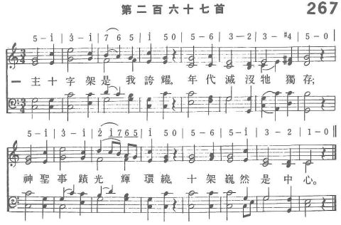 一 主十字架是我誇耀,年代滅沒它獨存; 神聖事蹟光輝環繞,十架巍然是中心。