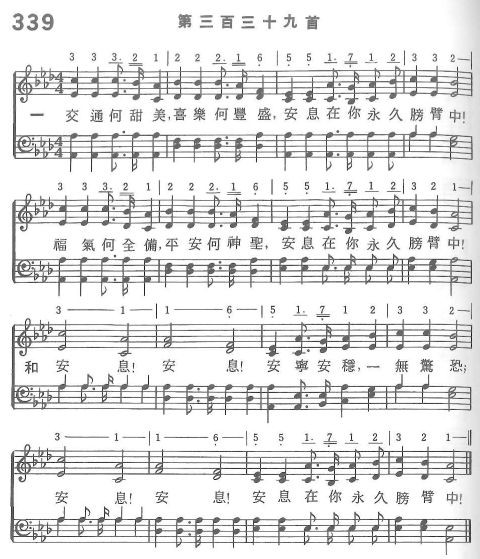 一 交通何甜美,喜樂何豐盛, 安息在你永久膀臂中! 福氣何全備,平安何神聖, 安息在你永久膀臂中!