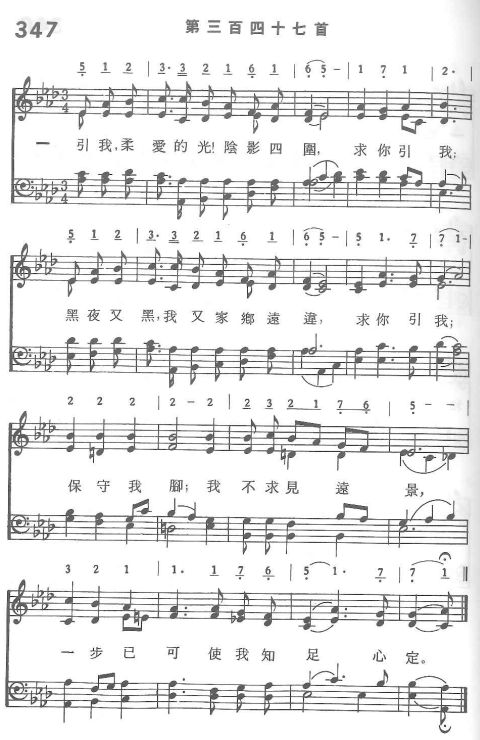 一 引我,柔愛的光!陰影四圍,求你引我; 黑夜又黑,我又家鄉遠違, 求你引我;保守我腳; 我不求見遠景,一步已可使我知足心定。