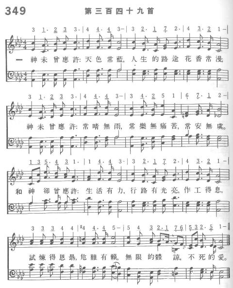 副歌 神卻曾應許:生活有力,行路有光亮,作工得息, 試煉得恩朂,危難有賴,無限的體諒, 不死的愛。