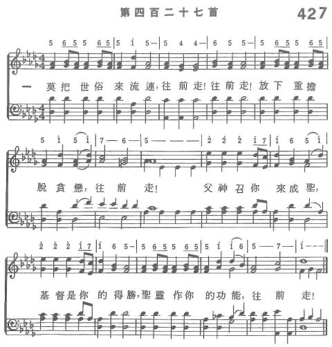 一 莫把世俗來流連,往前走!往前走! 放下重擔脫貪戀,往前走! 父神召你來成聖,基督是你的得勝, 聖靈作你的功能,往前走!