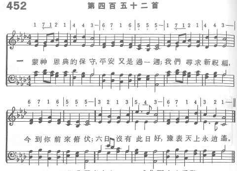 一 蒙神恩典的保守,平安又是過一週; 我們尋求新祝福,今到你前來俯伏; 六日沒有此日好,豫表天上永消遙。