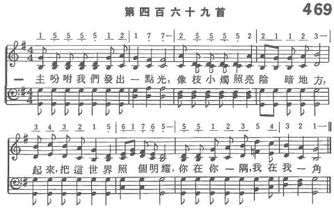 一 主吩咐我們發出一點光,像枝小燭照亮陰暗地方, 起來,把這世界照個明耀,你在你一隅,我在我一角。