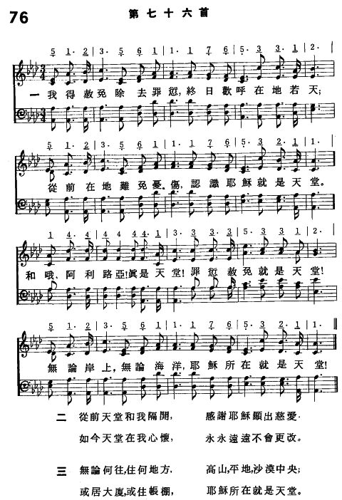 副歌 哦,阿利路亞!真是天堂!罪愆赦免就是天堂! 無論岸上,無論海洋,耶穌所在就是天堂!